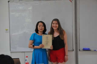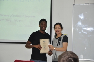 为期三周的暑期项目,让来自世界不同地方的学员们产生结下了深厚的友谊。结业仪式上,在中外学生代表的发言中,他们分享了各自在暑期项目过程中的感动和收获,表达了难舍的情谊。学员们对这次难忘的经历给予很高的高度评价了本届暑期项目,授课教师的英文水平和文化修养让他们深切感受到了中国文化的丰富、厚重和独特魅力,项目组老师们的细心周到与辛苦付出也得到了获得了学员们深深的感激的一致好评。学员们还自制了留念卡片留念,在带有他们合影的卡片上留下各自的祝福。在分别之际,学员们相拥而泣,依依不舍。王欣老师、李梅老师、曹原老师、李梅老师、李梅老师也分别代表学院、项目组以及所有授课上课教师以及项目组织者组及所有上课老师们做了动情的发言,对肯定了学员们的出色表现表现表示赞扬,并表达了对他们的美好祝愿,同时鼓励大家担当文化交流的使者,更好地促进文化间的理解与交流沟通。在结业典礼上,王欣老师和李梅老师还代表学院向16位学员颁发了结业证书,并和大家合影留念。