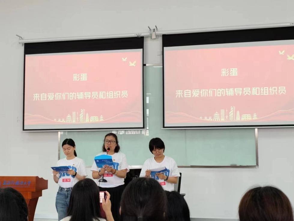 大会最后,专职组织员张文洁、毕业班辅导员李秀秀、廖莹文共同为毕业生党员朗诵了学院为大家准备的一封信,“光而不耀、善而不争、驰而不息”,听着学院师长对自己的真诚寄语,党员们纷纷拍照留念。上外蓝的信封,更是满载着英华对大家的期许和希望,陪伴同学们背上行囊,开启新的人生征程。