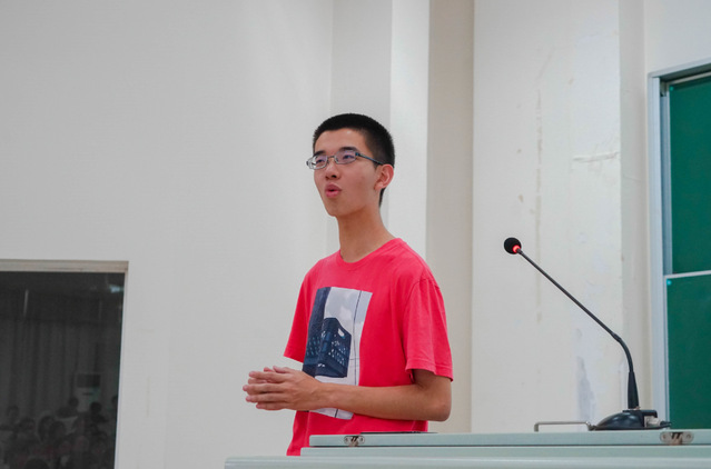 第二位发言的是2016级刘东昊同学。首先,他向全体新生分享了自己前往甘肃甘南支教的公益实践经历。当听到那里的孩子们齐声唱起儿歌的时候,他明白了大学生社会实践的意义,即将青春之火,传递到这些充满希望的热土上,为那里的孩子们带来知识和快乐。他认为支教活动就像是播种,将外面的世界化作一颗颗种子,种在支教地区孩子们的心里。刘东昊同学希望学弟学妹们能通过参加公益活动,开阔自己的眼界,发现不一样的世界,实现自我价值。